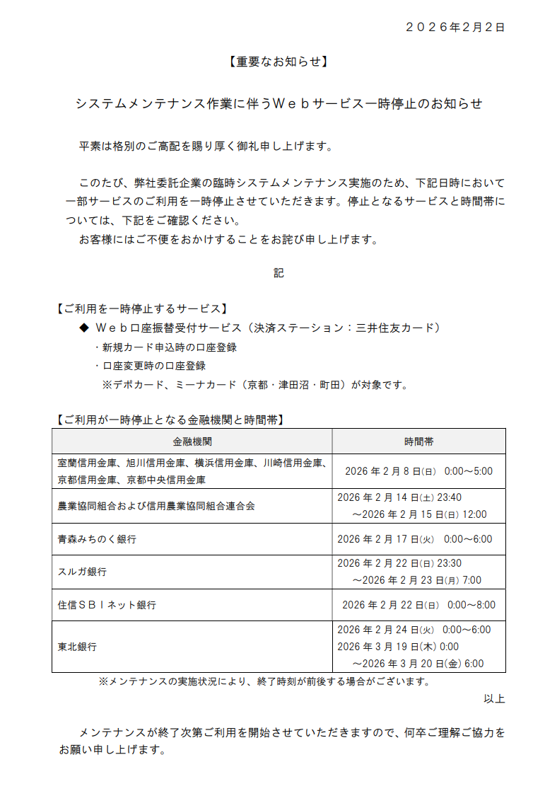 システムメンテナンス作業に伴うWebサービス一時停止のお知らせ