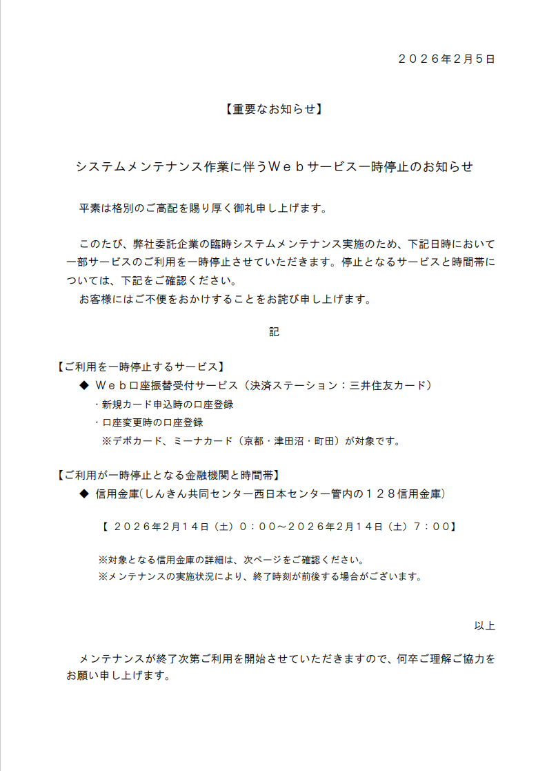 システムメンテナンス作業に伴うWebサービス一時停止のお知らせ
