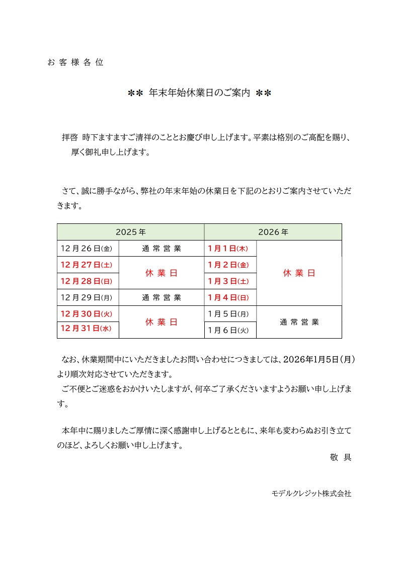 年末年始休業日のご案内