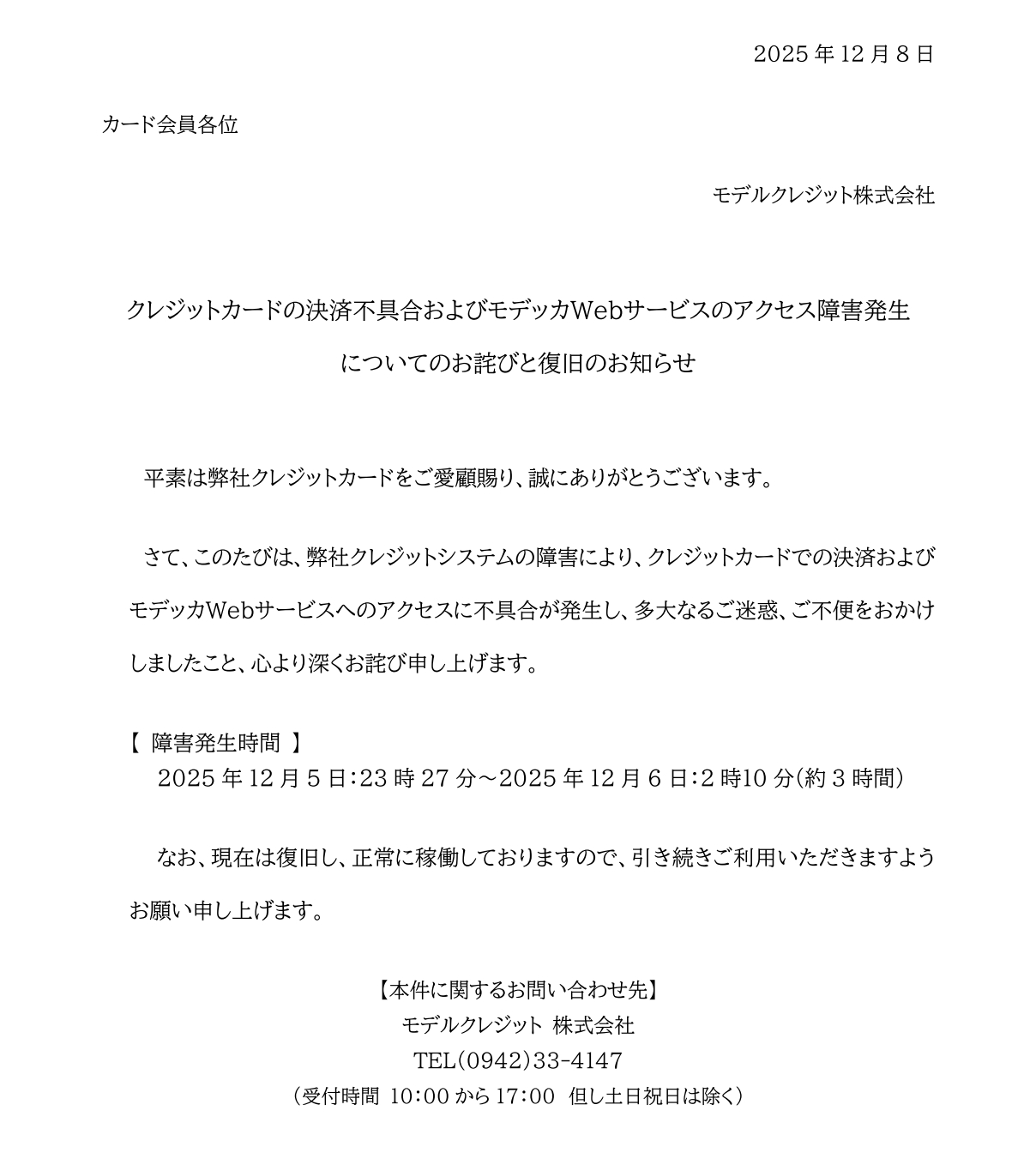 クレジットカードの決済不具合およびモデッカWebサービスのアクセス障害発生についてのお詫びと復旧のお知らせ